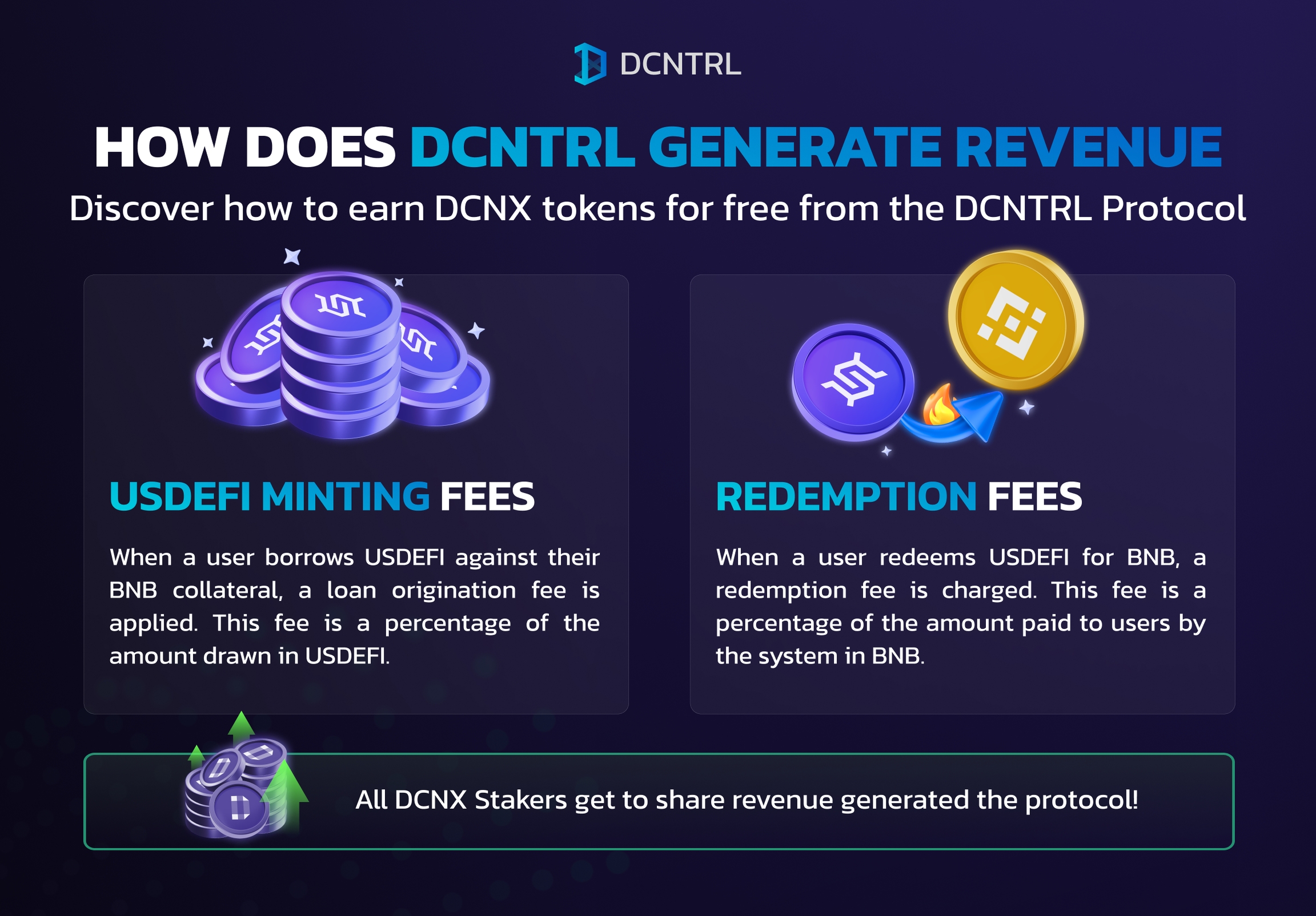 Протокол DCNTRL - это не просто эмитет Стейблкойна, обеспеченный BNB, это экосистема с разделением доходов, которая вознаграждает своих пользователей за их участие. Размещая DCNX, пользователи могут получать долю дохода от протокола, обеспечивая себе возможность пассивного заработка. Таким образом, интересы протокола совпадают с интересами его пользователей, что способствует формированию устойчивой и взаимовыгодной экосистемы.