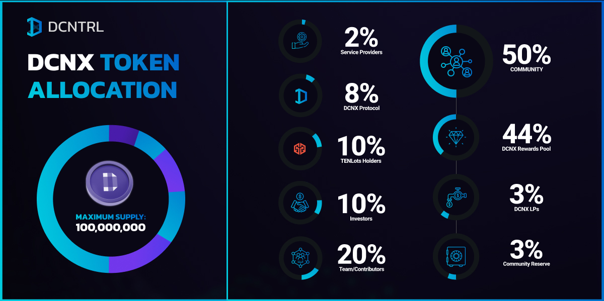 Токены DCNX являются неотъемлемой частью протокола DCNTRL, выступая в качестве основного механизма стимулирования и источника к получению дополнительных доходов от протокола. Токеномика DCNX призвана обеспечить долгосрочную устойчивость и рост протокола DCNTRL.