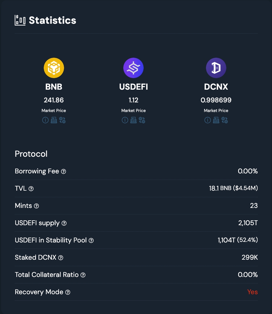 Recovery Mode: Режим Восстановления активируется, когда общий коэффициент обеспеченности (TCR) падает ниже 150%. В активном состоянии, Ваша кредитная позиция может быть ликвидирована, если коэффициент обеспеченности ниже 150%. Максимальный размер залога, который можно потерять в результате ликвидации, ограничен 110% от суммы долга в USDEFI. Ограничиваются также операции, которые могут негативно повлиять на TCR.