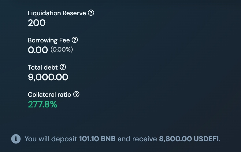 Collateral Ratio: Соотношение между долларовой стоимостью залога и вносимым долгом (в USDEFI). Хотя в обычном режиме работы минимальный коэффициент обеспечения составляет 110%, рекомендуется поддерживать коэффициент обеспечения всегда выше 150%, чтобы избежать ликвидации в Режиме Восстановления.