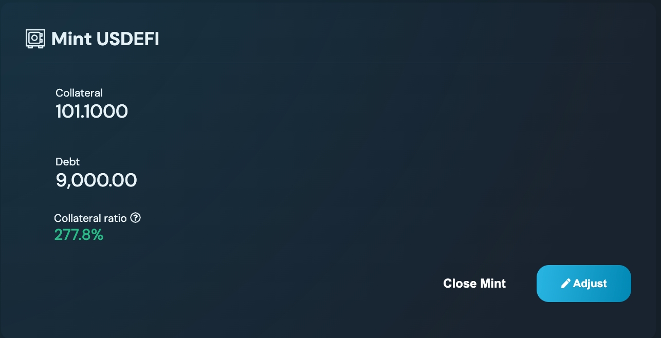 После минта USDEFI Вы можете управлять своей позицией с помощью кнопки "Adjust". Здесь Вы можете: