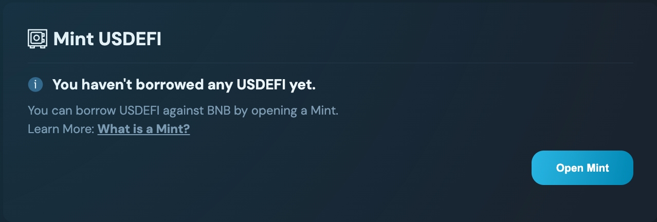 Протокол DCNTRL позволяет пользователям минтить USDEFI - стабильную монету, привязанную к доллару США, путем внесения BNB в качестве залога. В этом разделе Вы узнаете, как минтить USDEFI, управлять позицией и регулировать соотношение залогов.
