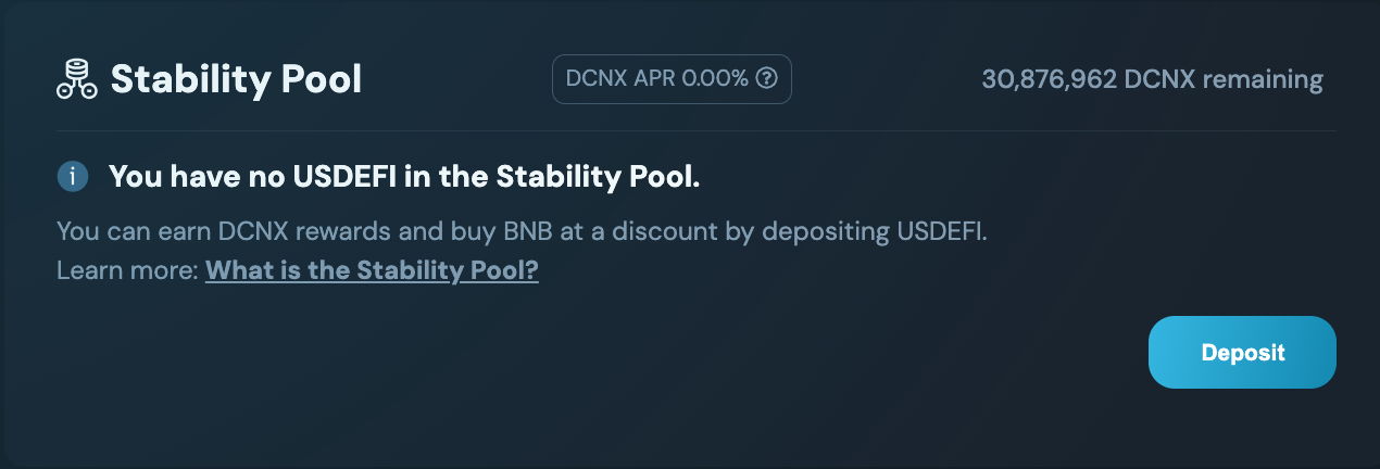 The Stability Pool is where you can stake your USDEFI to support the health of the protocol. By staking USDEFI in the Stability Pool, you can earn DCNX rewards and contribute to maintaining the stability of the system.\
