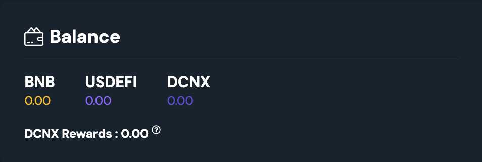 The Balance Section shows the assets available in your wallet, including BNB, USDEFI, and DCNX. It also displays any pending DCNX rewards.
