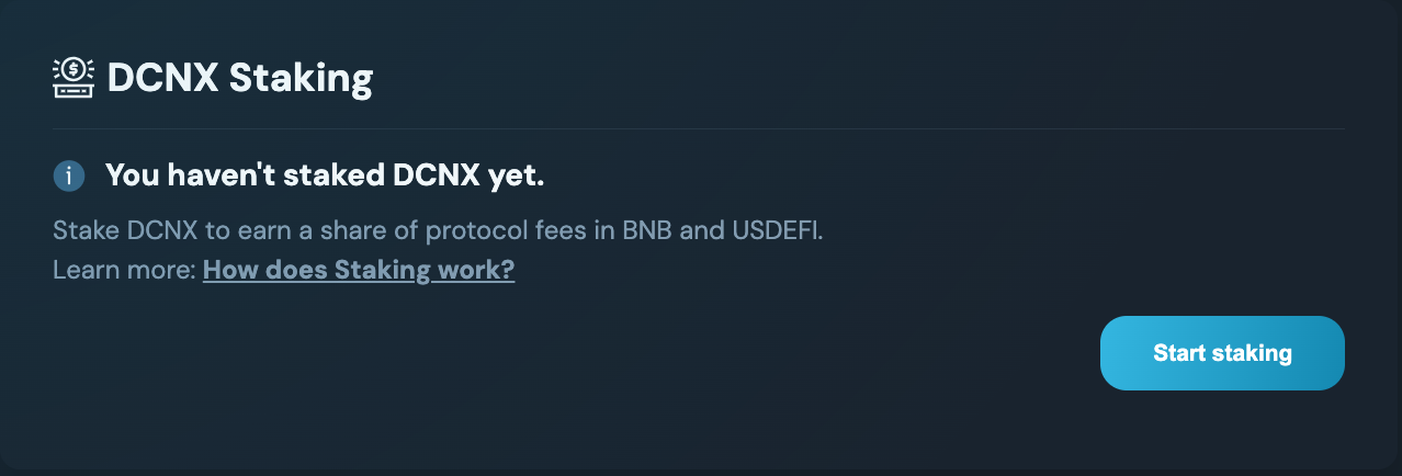 The DCNX Staking section is where you can manage your DCNX stakes. The more DCNX you stake, the more protocol revenue you will earn. This section provides an interface for managing your stakes and tracking your earnings.\