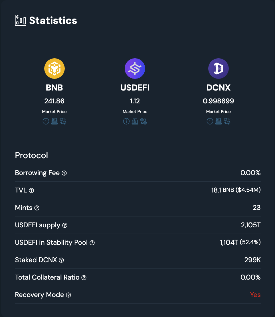 * **Total Collateral Ratio**: This is the ratio of the Dollar value of the entire system collateral at the current BNB:USD price, to the entire system debt.
