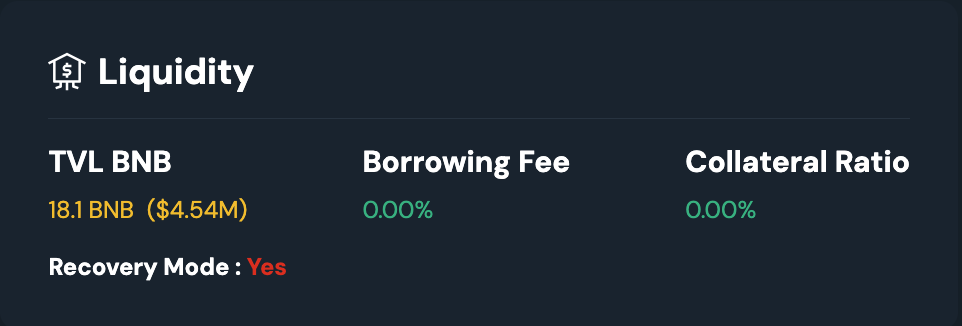 The Liquidity Section provides live stats for the Total Value Locked (TVL) in BNB, the Borrowing Fee, and the Total Collateral Ratio. This section allows you to monitor the health of the ecosystem and make informed decisions.